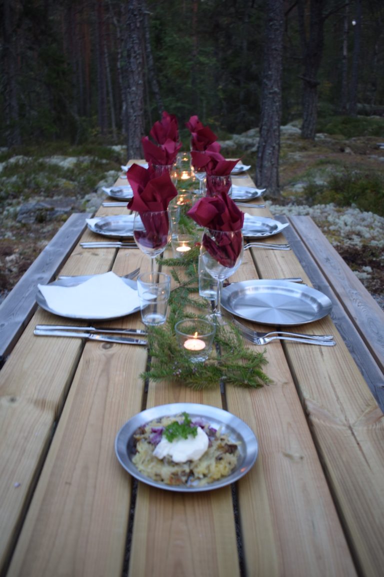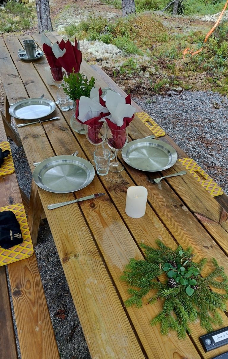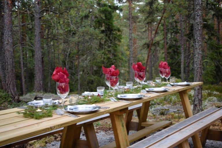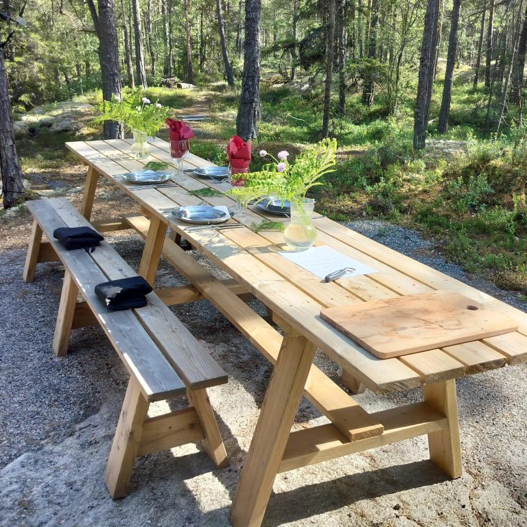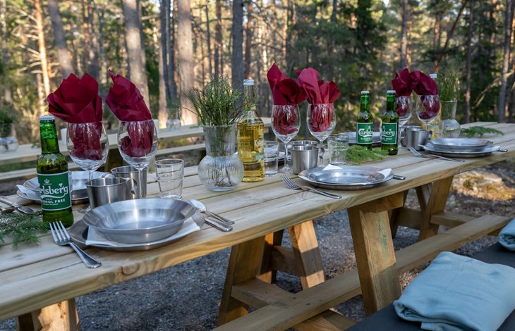 Middagen avnjuter ni sedan vid det vackert dukade bordet i naturen.