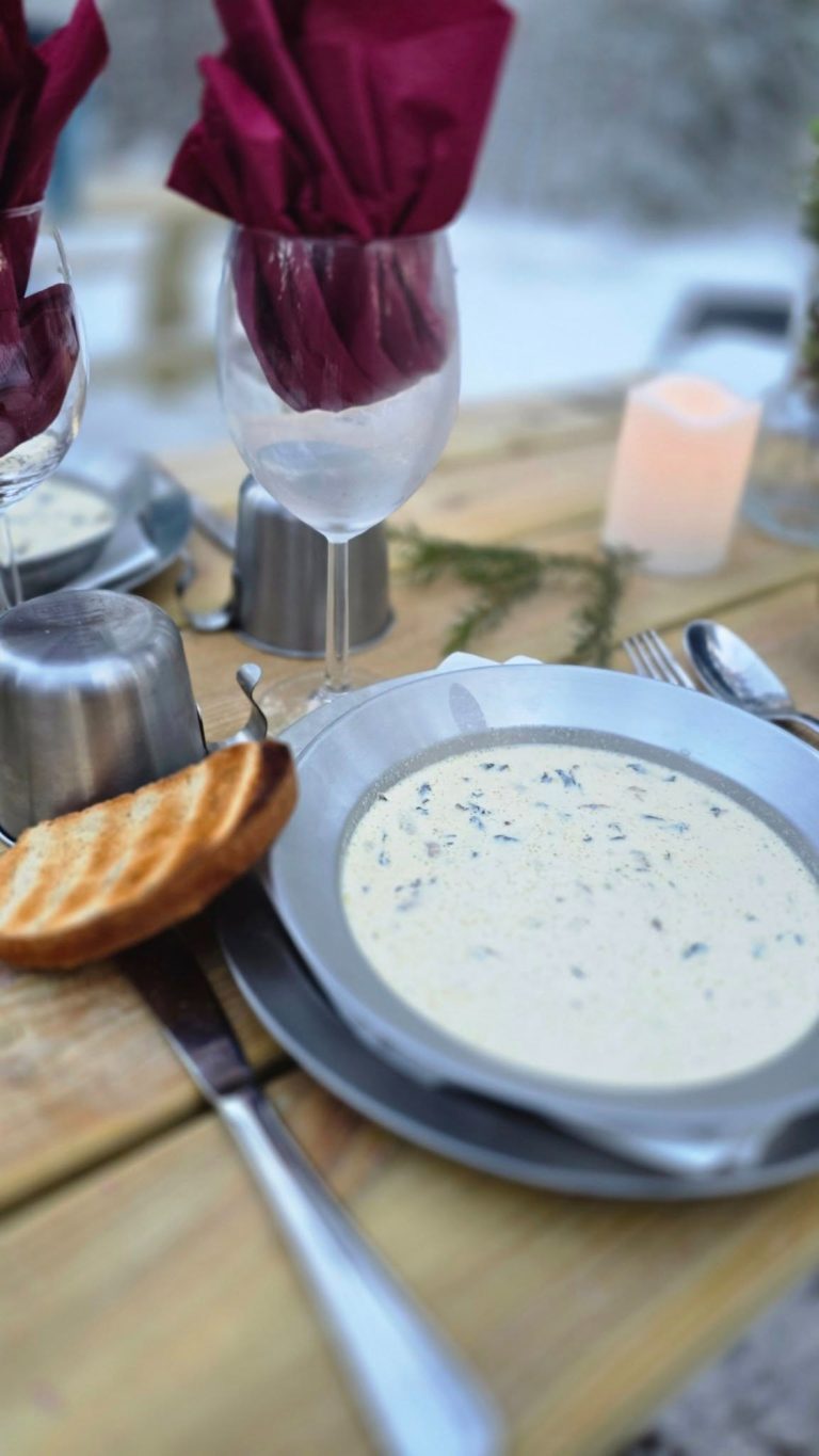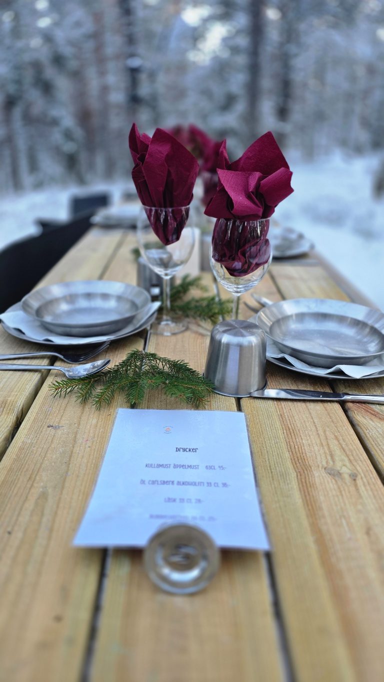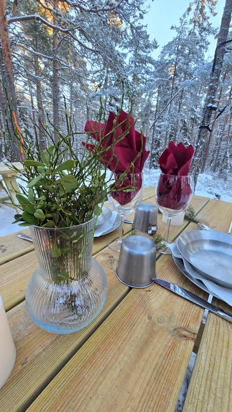 Middagen avnjuter ni sedan vid det vackert dukade bordet i naturen.