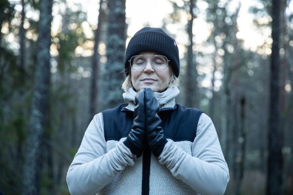 ”En varm känsla sprider sig genom kroppen när jag uppmärksammar mina andetag och tittar upp mot himlen och lyssnar på vinden som viner genom träden.”